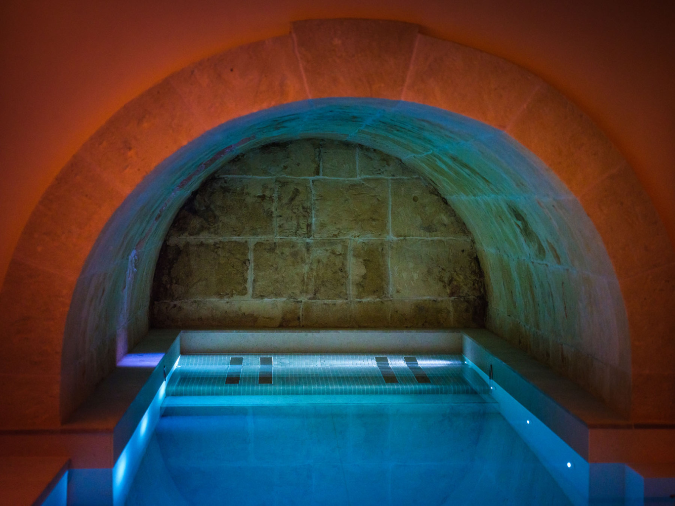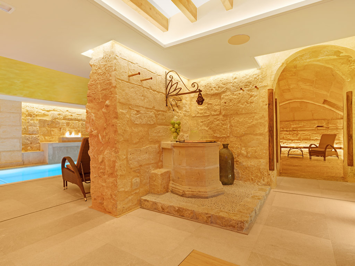 The spa located in the basement of the house boasts of a large pool, possibly the longest in Palma old town, which enters the original water reservoir with vaulted ceiling. The sandstone walls and natural colours create an atmosphere of peace and serenity. For your enjoyment you will find the sauna, steam bath, a relaxation area with tea service as well as the large pool with hydromassage and majestic shower sensation. If you wish we can also arrange personalized treatments and private yoga sessions.